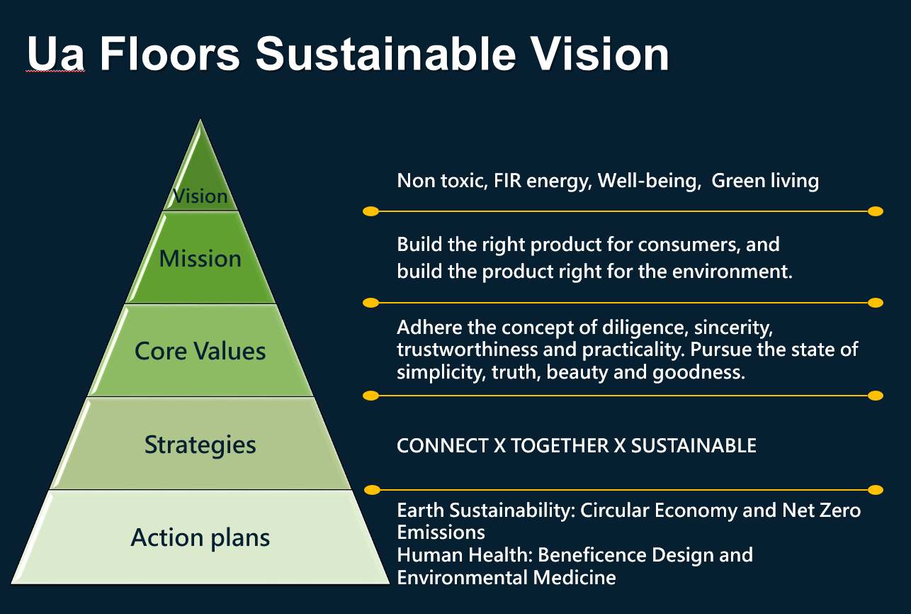 As international policies on climate change and net-zero emissions become clearer. Ua Floors start implementing net zero emission and ESG initiatives since 2023.We have obtained the ISO14064-1 certificate for quantification and reporting of greenhouse gas (GHG) emissions and removals by the end of 2023. And we also incorporated the sustainable development goals into our business philosophy, and formulate a Ua's vision and policy.