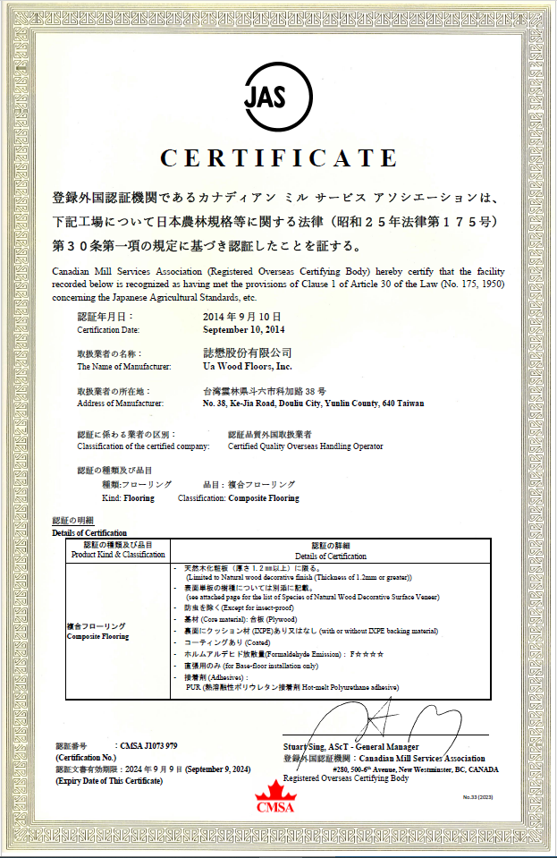 The JAS certificate was given by the Canadian Mill Services Association in recognition of having met the provisions of Clause 1 of Article 30 of the Law concerning the Japanese Agricultural Standards.