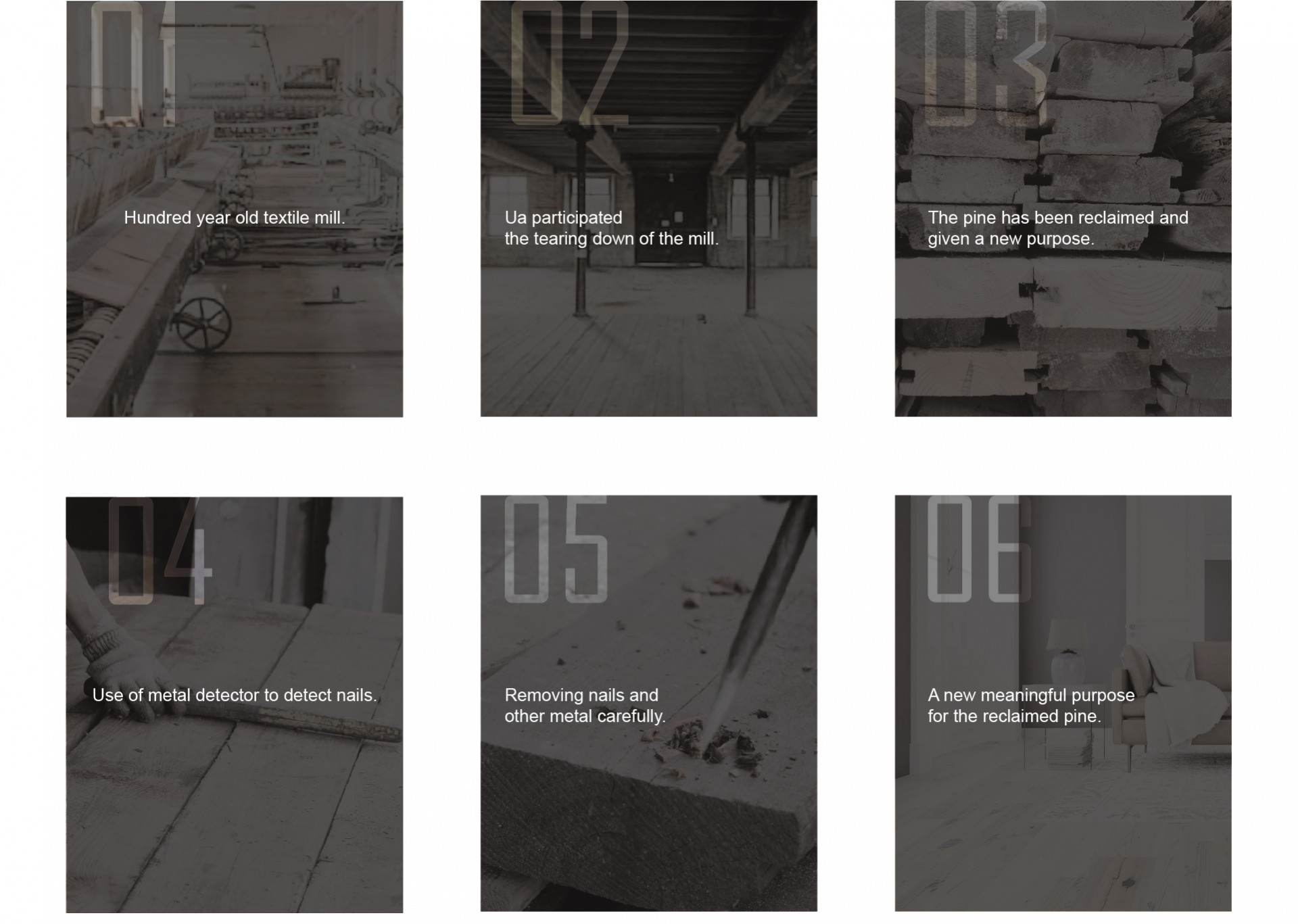 Heart pine was mostly used as a building material, especially in churches and textile mills in 1900s. People worked together in a mill and gathered together in a church year after year. A hundred years passed, buildings are being taken down for reconstruction. Since these buildings had been part of the history, we decided to conserve all these meaningful wood and remake it into our products. When you see these beautiful floors, you see the history through the nail holes and marks on each board.