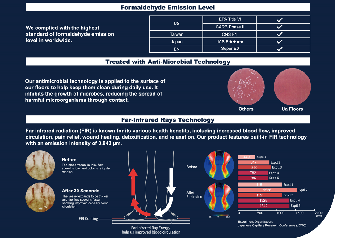 ‘Build the right product for consumers and build the product right for the environment’ is always the goal of Ua Floors. The research and development team has combined far-infrared and antiseptic technology in flooring. These new technologies enhance the product's functionality and health benefits, creating a healthier and more comfortable living environment for your home or commercial space.