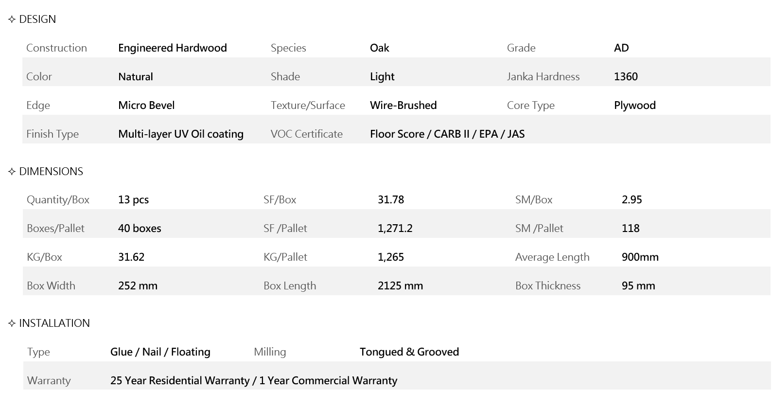 Kervignac Oak Engineered Hardwood Flooring is Grade ABCD, also known as natural grade or mill-run wood. This means that the wood has bigger knots (giving each plank a unique look that does not match any other) and more streaks and color variation. The results are smooth, but planks may sport character marks that go well with any type of interior design.