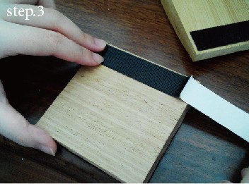 Find the Velcro strips with hooks from the box package. Apply two stripes to each Wood Cube. |