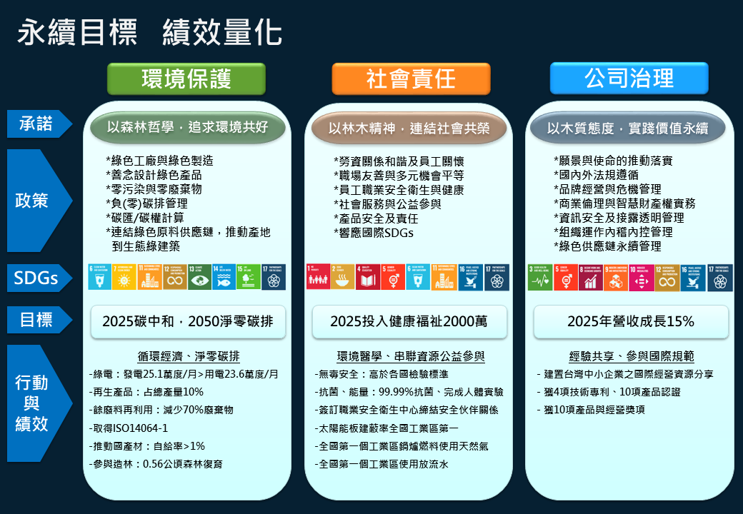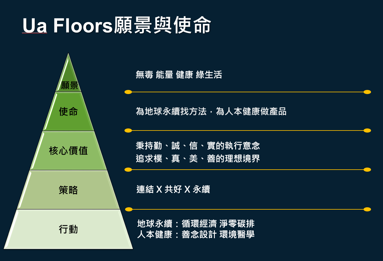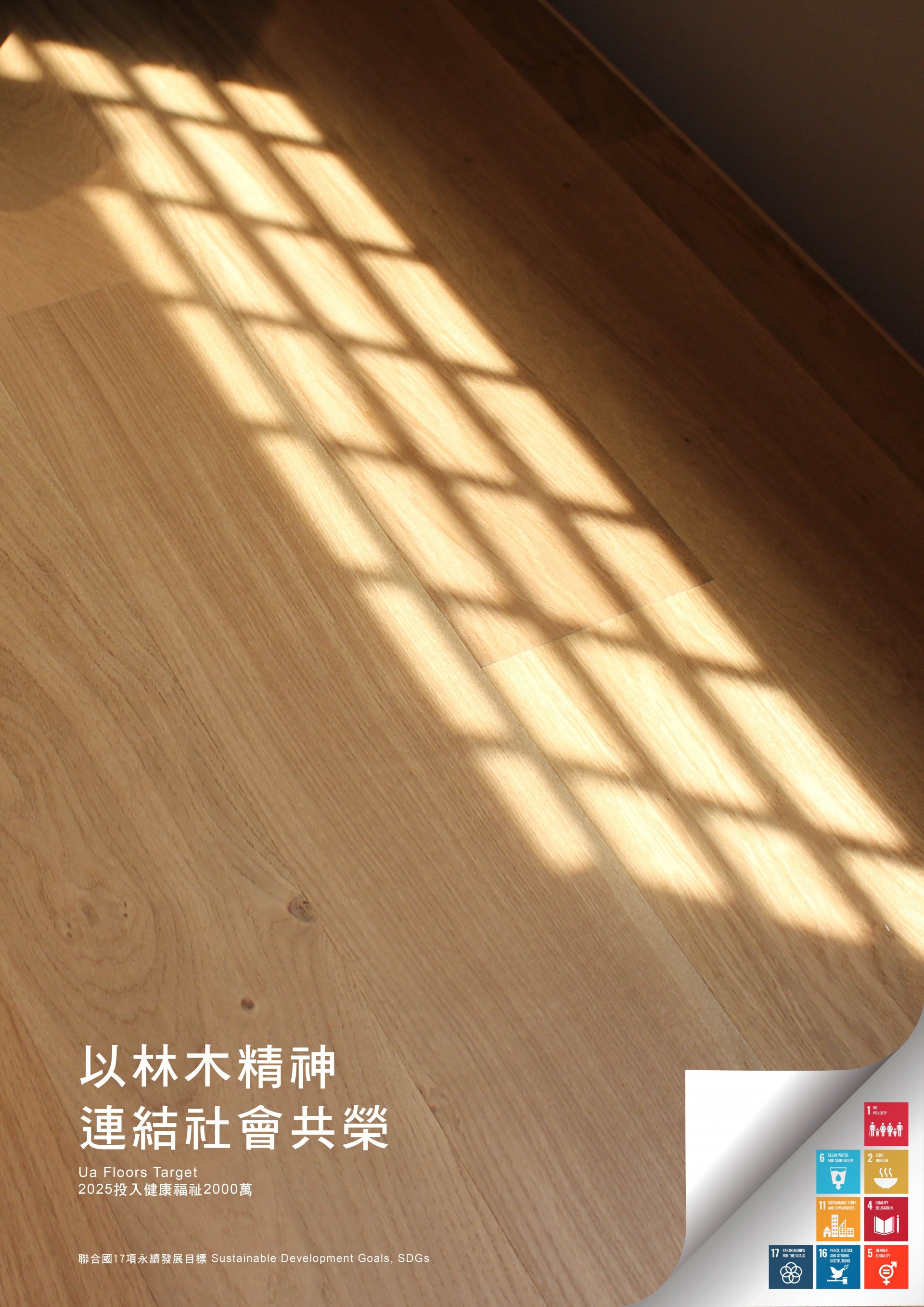 Ua Floors以聯合國永續發展目標(SDGs) 為永續藍圖,將環境、社會及公司治理(ESG) 理念融入企業承諾與營運策略,整合內外部資源,以森林哲學,追求環境共好;以林木精神,連結社會共榮;以木質態度,實踐價值永續。我們期許自己不斷進步與創新,成為台灣木製產業變革的力量,積極為後代推動更好的未來。
