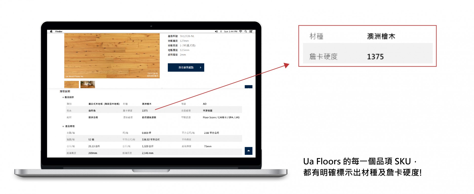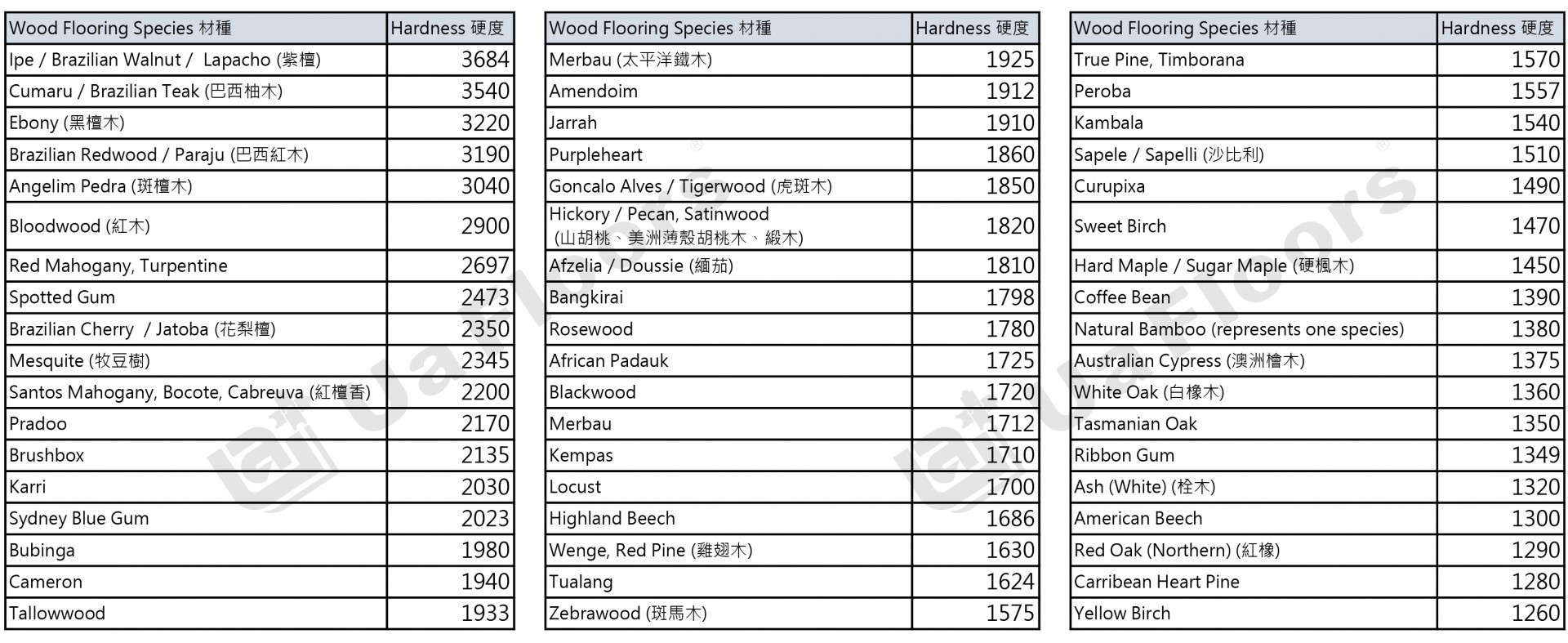 別擔心! 小編替大家整理了「不同空間的木地板硬度建議」和「總共54個材種的硬度大總表」! Ua Floors 的每一個品項SKU也都有標示出詹卡硬度!
