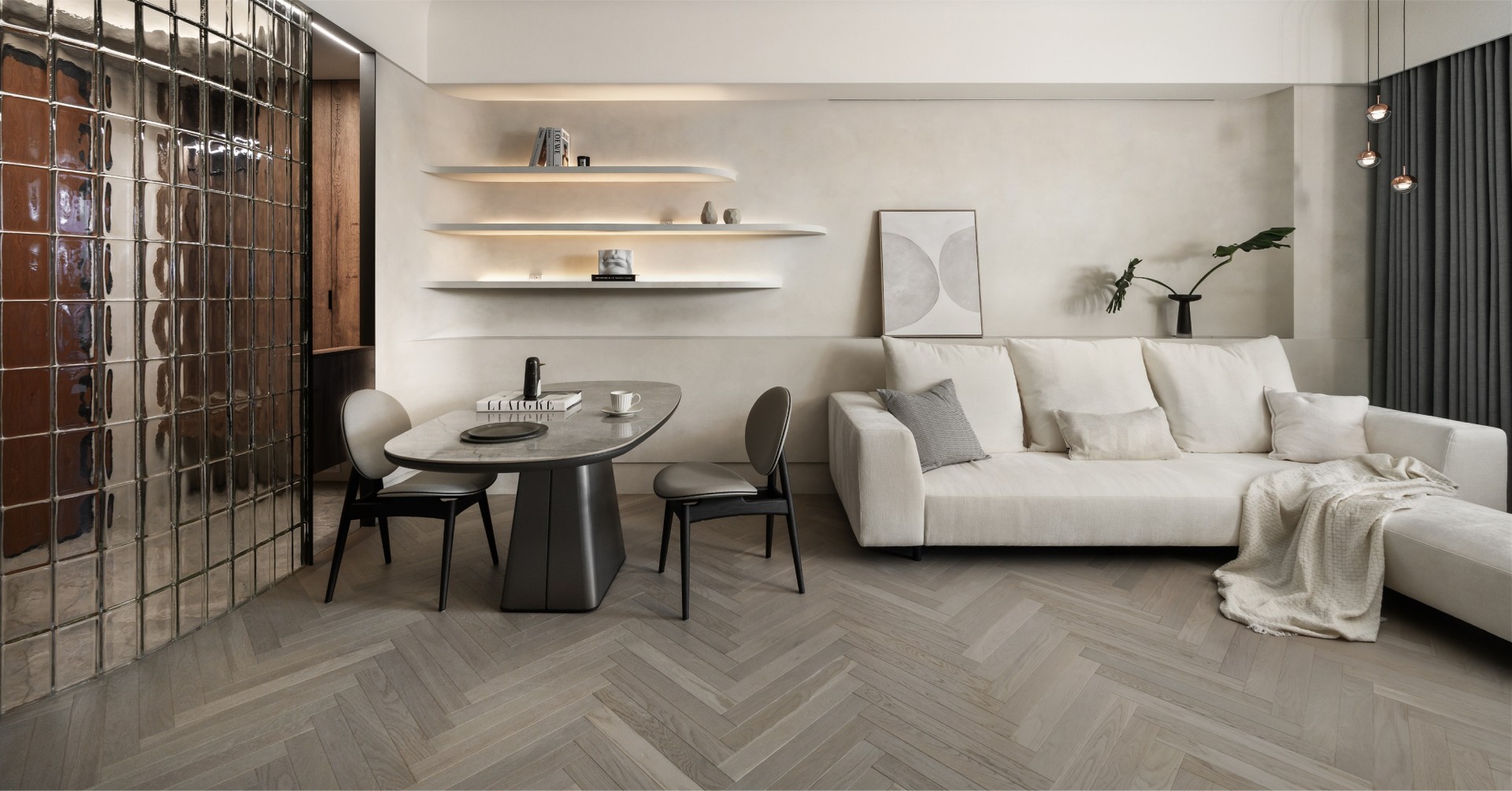 念念國際 設計總監分享著:「我們想要的是畫面的純淨感,但又不能太空的時候,人字拼的地板就非常的適合。」Ua Floors以頂級木材與嚴謹的工藝技術,打造出細膩的人字拼木地板,將大自然的鬼斧神工帶入您的生活空間。