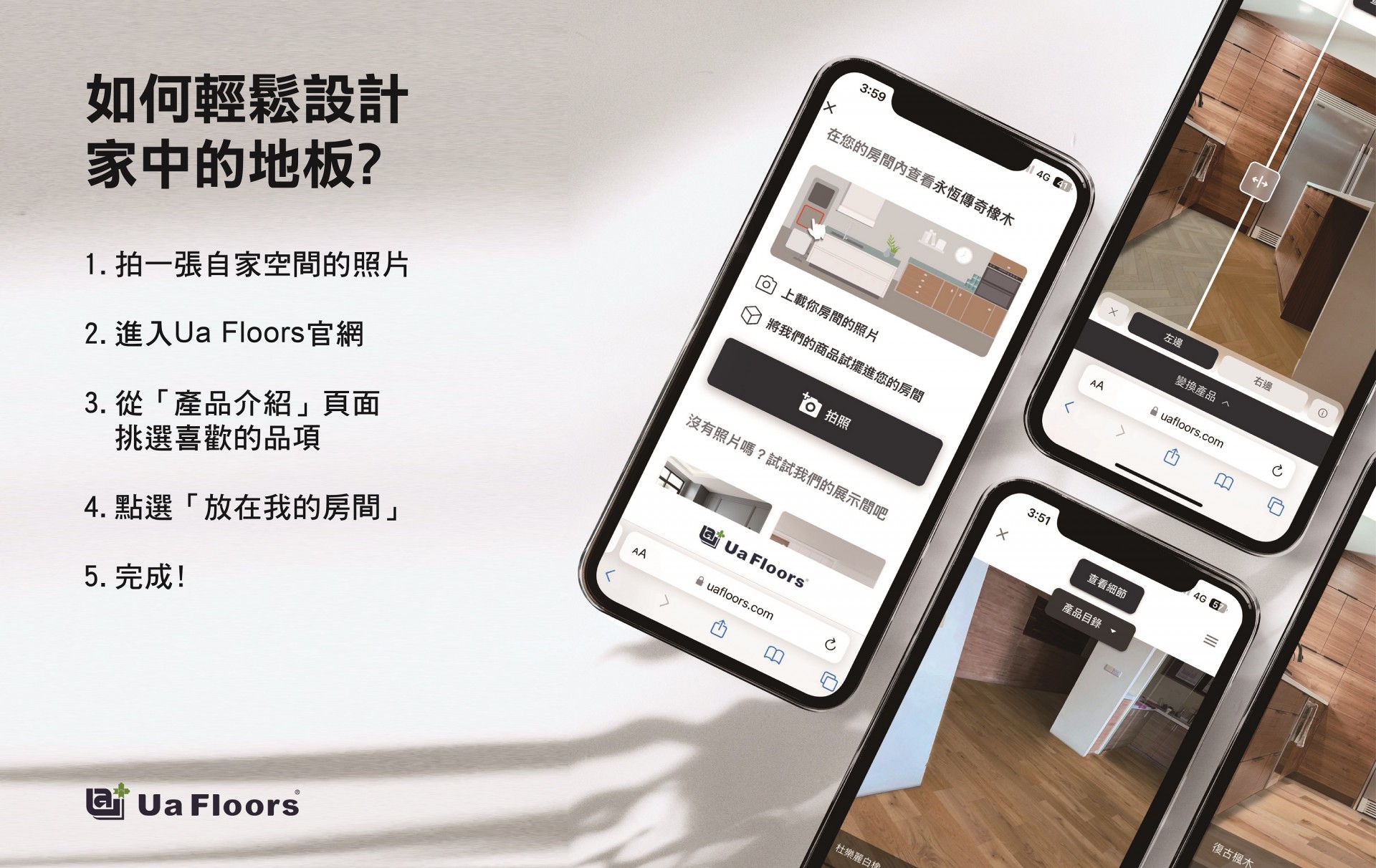 不確定哪款木地板最適合您的居家風格? 透過 Ua Floors 「線上試鋪」功能,一鍵試換地板 立即預覽您的理想居家樣貌!